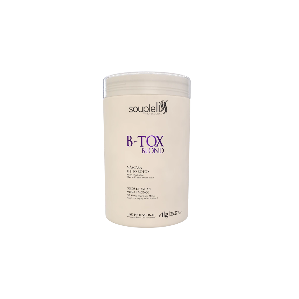 Blond liss B-tox Máscara Matizadora SoupleLiss é um repositor da massa molecular que atua no cortex da fibra capilar,indicado para todos os tipos de cabelos possui formula inovadora eficaz com queratina e silicone, formadores de uma película protetora que envolve os fios da raiz até as pontas restaurando a flexibilidade natural dos cabelos e dando hidratação e resistência aos fios.