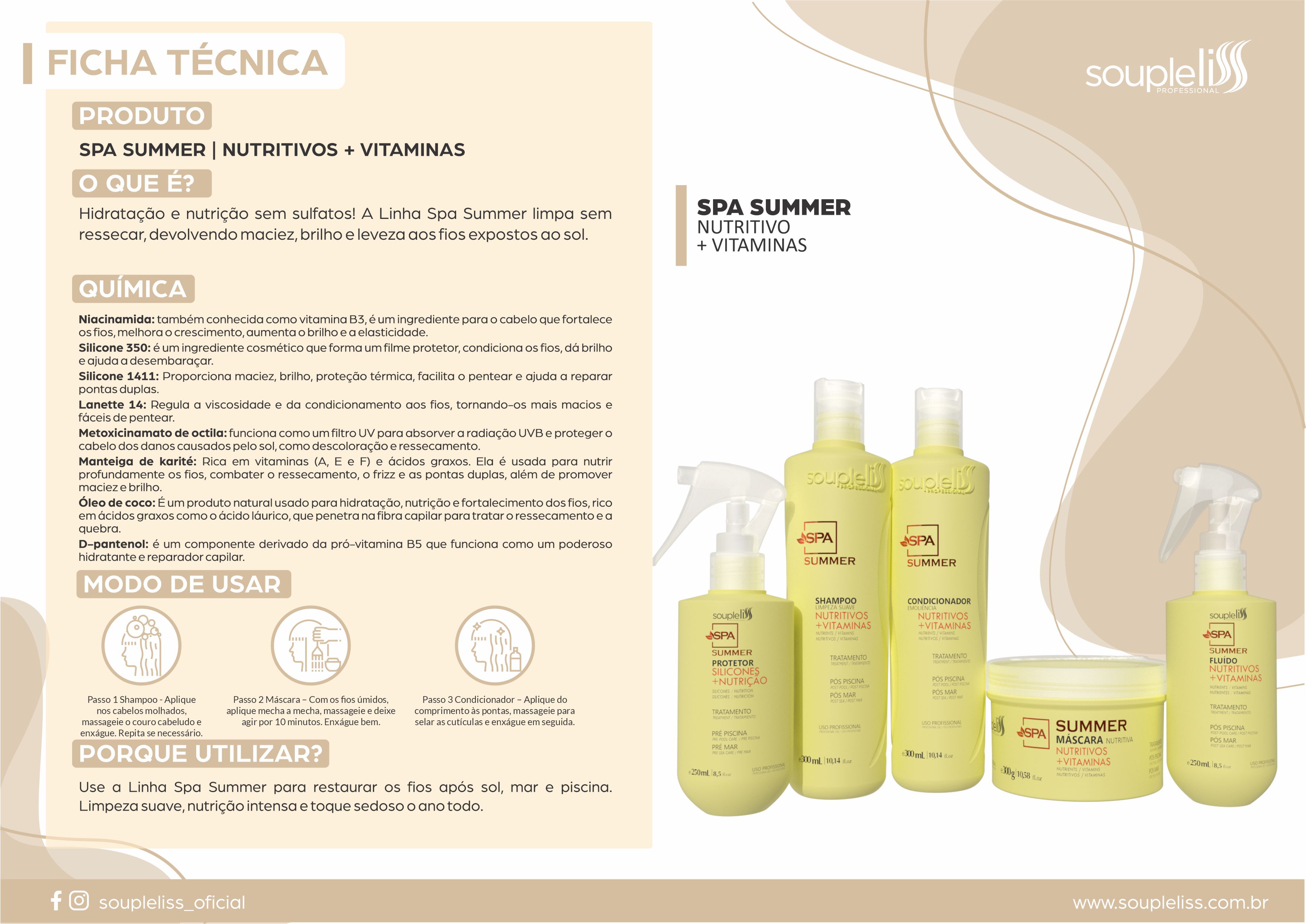 A Linha Spa Summer foi criada para cuidar dos fios antes e depois da exposição ao sol, ao sal e ao cloro, mantendo-os saudáveis, macios e cheios de brilho. Com fórmulas livres de sulfatos e petrolatos, ricas em vitaminas e nutrientes, cada produto oferece um cuidado único para que seus cabelos vivam o verão com leveza e beleza natural. Shampoo Spa Summer: Limpeza suave e equilibrada! Remove impurezas, resíduos de sal e cloro sem ressecar, preservando a hidratação natural dos fios e deixando o cabelo leve e renovado. Condicionador Spa Summer: Nutrição e toque sedoso! Enriquecido com vitaminas e agentes emolientes, devolve maciez e brilho, deixando o cabelo fácil de pentear e irresistivelmente suave ao toque. Máscara Spa Summer: Revitalização profunda! Repõe os nutrientes e vitaminas perdidos pelo sol, mar e piscina, restaurando a força, o movimento e o brilho dos fios. Protetor Spa Summer: Seu escudo protetor antes do banho de mar ou piscina! Cria uma película leve que protege contra os danos do sal e do cloro, mantendo os fios saudáveis e com brilho natural mesmo após o mergulho. Fluido Spa Summer: Toque final de leveza! Facilita o desembaraço, devolve a nutrição e o brilho natural dos cabelos. Ideal para usar após o banho ou a qualquer hora do dia para um visual macio, leve e perfumado.